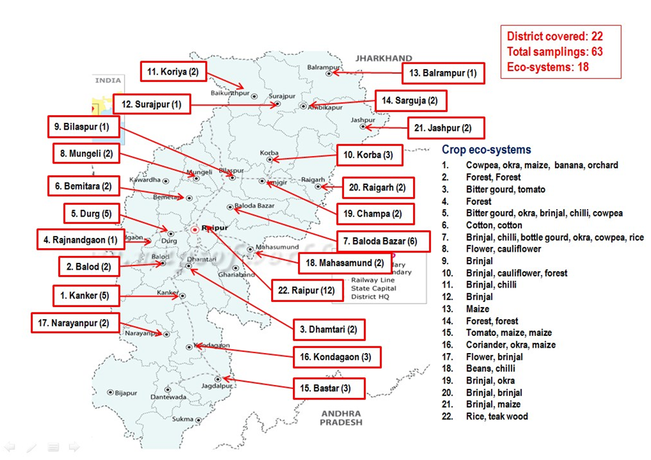 Native biocontrol agents are potential to manage Lepidoptera pests. Egg parasitoids especially Trichogramma spp., belonging to the order Trichogrammatidae reported over 230 species are widely used to the biocontrol of eggs of over 200 insect species of moths and butterflies pests of crops. The sentinel Corcyra egg trap card were tied in 63 places in 18 crop and non-crop ecosystems, belonging to 22 districts of Chhattisgarh during 2019 (Fig. 3).