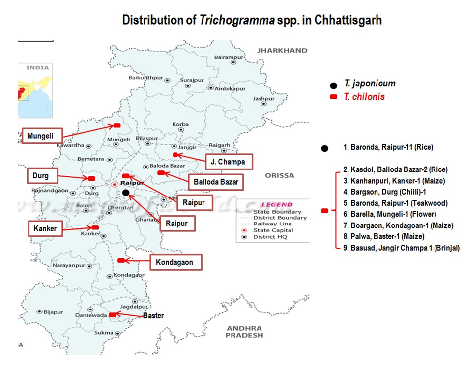 - During four surveys in 22 districts of Chhattisgarh, 16 native egg parasitoid including Trichogramma japonicum and T. chilonisand 12 native Bacillus thuringiensis were isolated, identified and bioassayed