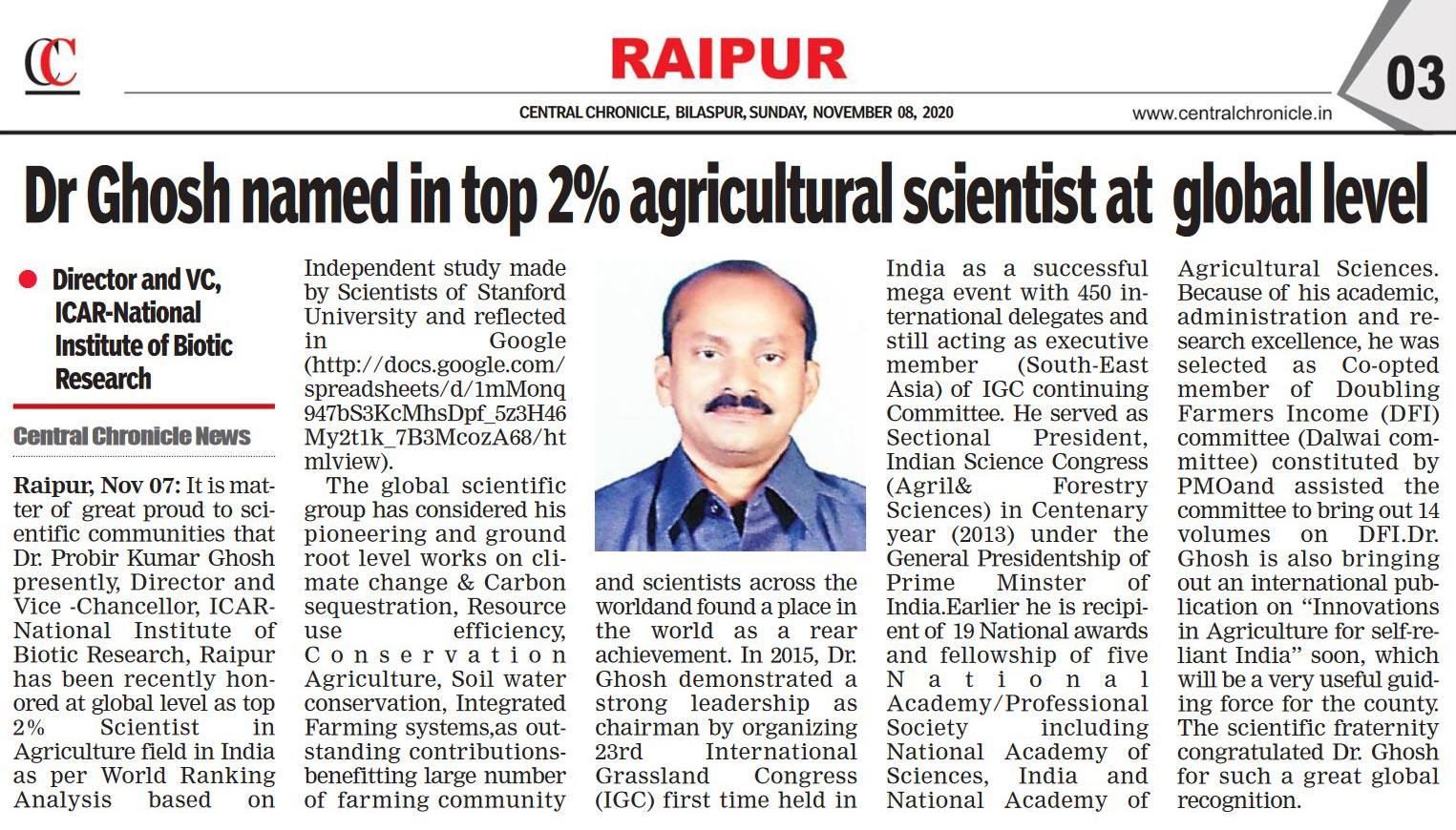 Dr P K Ghosh Director & Vice Chancellor, ICAR-NIBSM named in top 2% agricultural Scientist at Global level