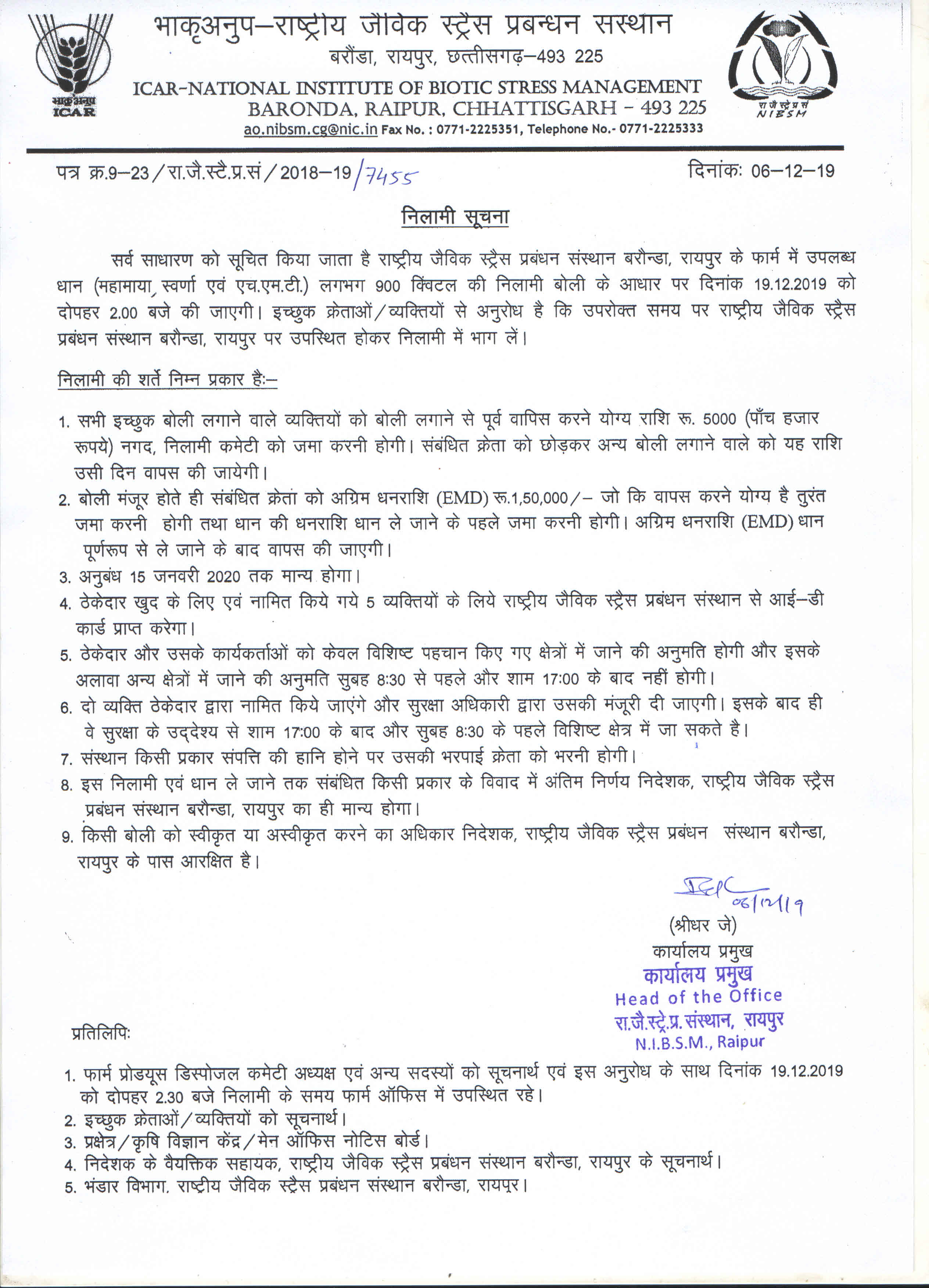ICAR-NIBSM shall remain close from 09 to 19.04.2021 due to COVID 19 Lock-down at Raipur, C.G.