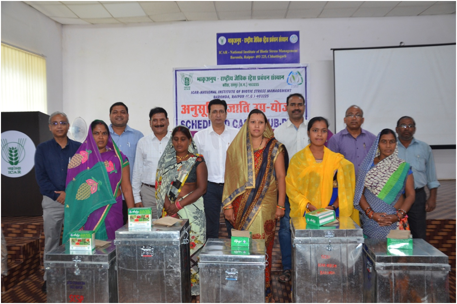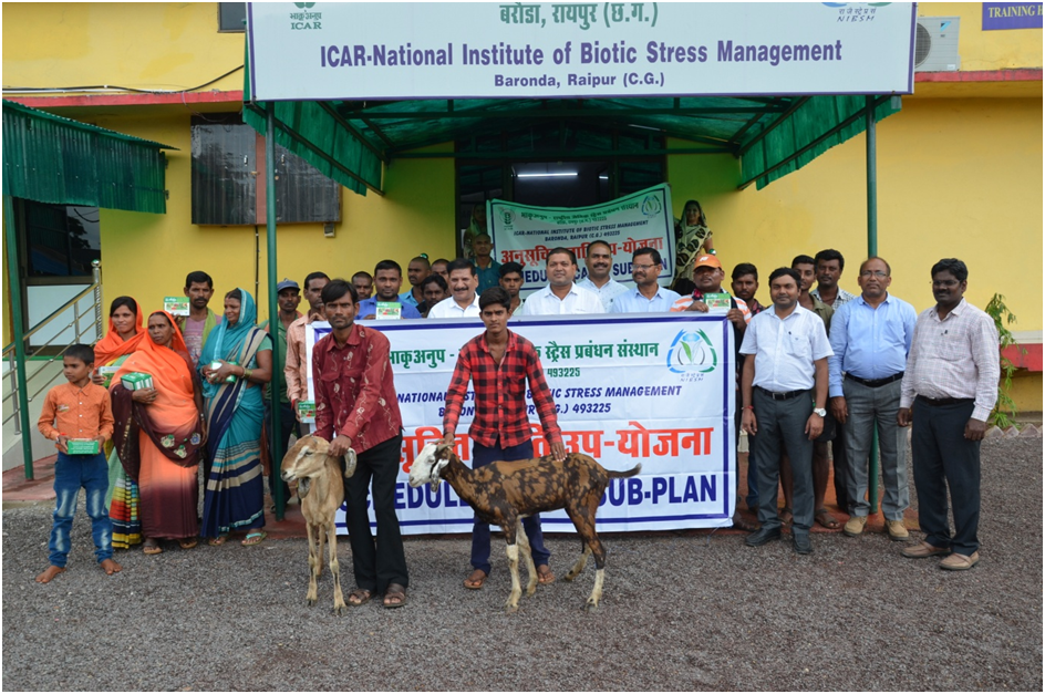 The ICAR-National Institute of Biotic Stress Management, Raipur, feels proud and privileged to implement Schedules Caste Sub-Plan (SCSP) which is an umbrella strategy to development for the benefit of Scheduled Castes. The main objective is to give a thrust to family oriented schemes of economic development of SCs below the poverty line, by providing resources for filling the critical gaps and for providing missing vital inputs so that the schemes can be more meaningful. I am thankful to Director sir and all the SCSP team members for entrusting the responsibilities of SCSP at ICAR-NIBSM,Raipur. ICAR-NIBSM, Raipur had initiated its activities under SCSP component during 2018-2019 and 2019-2020. The fund allocated under Schedule cast sub plan (SCSP) was Rs. 142.86 Lakhs during Financial year, 2019-20. For implementation of SCSP activities in Raipur districts villages under Tilda Block, Dharsiwa Block, Aarang Block, Mandir Housad block were selected in collaboration with KVK Raipur and NRLM, Raipur (National Rural Livelihood Mission ). The following activities viz., distribution of goats (500 units) Kadaknath chicks (20000 units), Agricultural Implements prototype from ICAR-CIAE, Bhopal, (Pedal operated potato peeler (30), Pedal operated potato slicer (30), Motorized Dal mill with 2HP motor (30), Multipurpose grain mill with 1 hp motor (60), Pedal cum power operated grain cleaner (40) ) and Seed storage Bins (800 units) were undertaken for livelihood improvement of SC farmers (1140 SC farmers/ farm families benefited) at Raipur districts of Chhattisgarh.